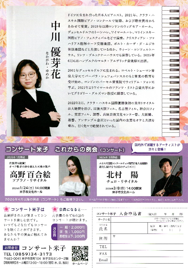 電話でのお問い合わせは TEL.0859-34-3173 メールアドレス concertyonago@sea.chukai.ne.jp
